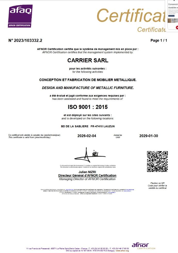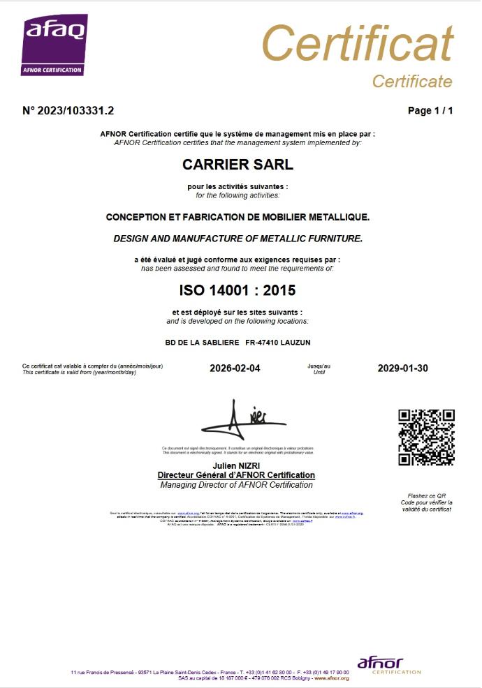 Avec Mobilier CARRIER, vous aménagez vos espaces de manière responsable, en privilégiant un mobilier qui respecte les normes environnementales les plus strictes.